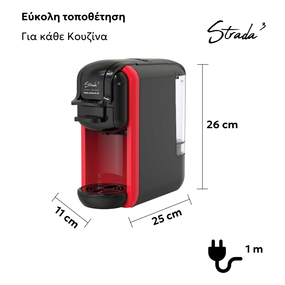 Η καφετιέρα Telemax Strada 3-1 είναι η απόλυτη λύση για τους λάτρεις του καφέ που αναζητούν ποικιλία και ποιότητα. Με ισχύ 1450W και πίεση 19 Bar, προσφέρει επαγγελματικό αποτέλεσμα στο σπίτι. Είναι συμβατή με κάψουλες τύπου Nespresso®, Dolce Gusto® και αλεσμένο καφέ, εξασφαλίζοντας πλούσιο άρωμα και τέλειο καϊμάκι σε κάθε φλιτζάνι.