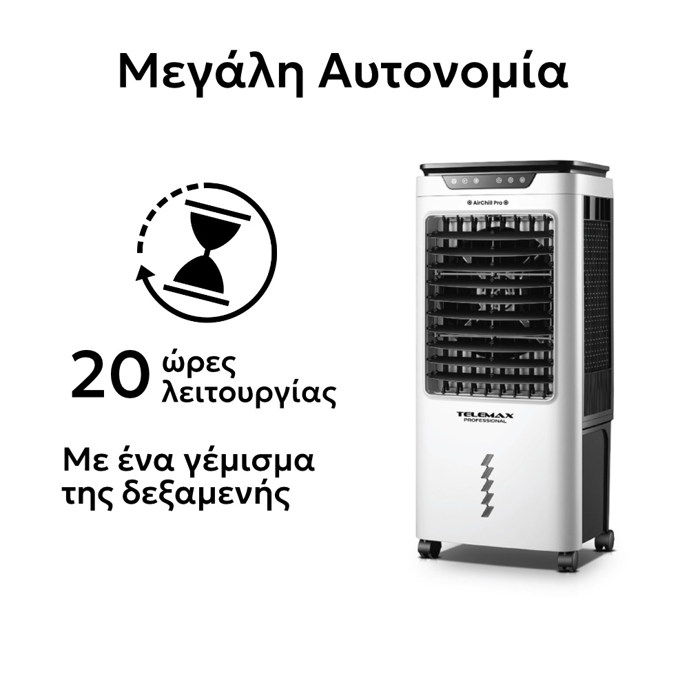 Το Air Cooler Telemax AirChill Pro LBW-6500RC προσφέρει 80% εξοικονόμηση ενέργειας σε σύγκριση με τα συμβατικά κλιματιστικά, καθώς λειτουργεί με μόλις 120W ισχύος, διατηρώντας παράλληλα υψηλή απόδοση ψύξης. Η χαμηλή κατανάλωση νερού, 1,8 λίτρα την ώρα, διασφαλίζει οικονομία στη λειτουργία του.