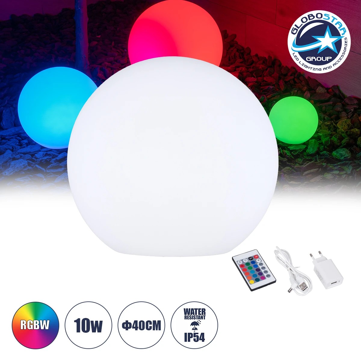LEDTM® GARDENGLOW 85825 Ακρυλικό Φωτιστικό Μπάλα Εξωτερικού Χώρου – Πισίνας LED Globe 10W Φ40 Επαναφορτιζόμενο Μπαταρίας με Καλώδιο USB – Φορτιστή και Ασύρματο Χειριστήριο IR Αδιάβροχο IP65 Πολύχρωμο RGBW