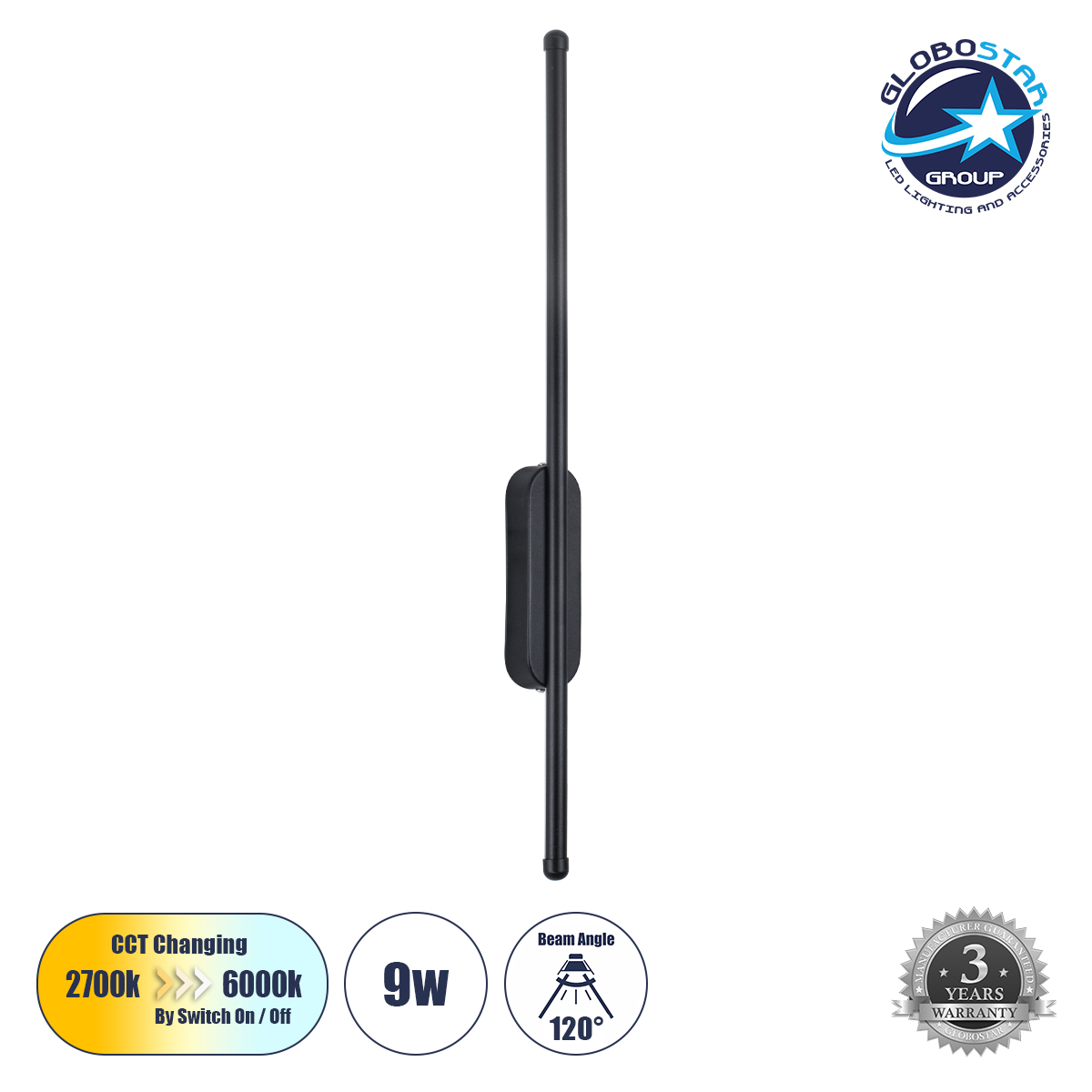 LEDTM® HARLEM 61331 Μοντέρνο Φωτιστικό Τοίχου – Απλίκα LED 9W 1080lm 120° AC 220-240V IP20 Ρυθμιζόμενο Λευκό CCT με On/Off 2700K/4500K/6000K – Lumileds SMD Chip – Μαύρο Ματ – Μ5 x Π4 x Υ60cm – 3 Χρόνια Εγγύηση