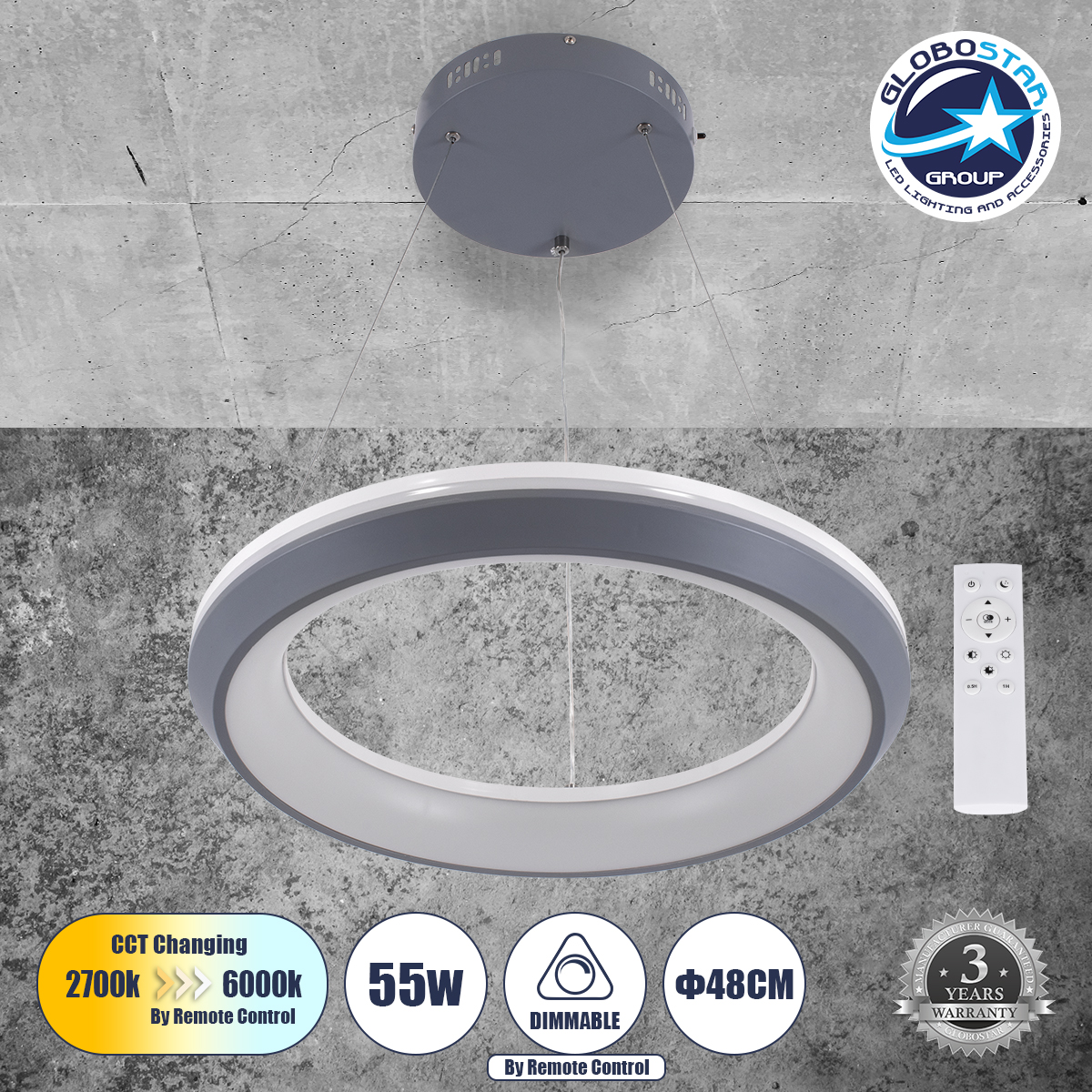 LEDTM® MELINA 61045 Μοντέρνο Κρεμαστό Φωτιστικό Οροφής LED 55W 6376lm 120° AC 220-240V IP20 Ρυθμιζόμενο Λευκό CCT με Χειριστήριο από 2700K έως 6000K Dimmable – Lumileds SMD Chip – Γκρι & Λευκό – Μ48 x Π48 x Υ6.5cm – 3 Χρόνια Εγγύηση