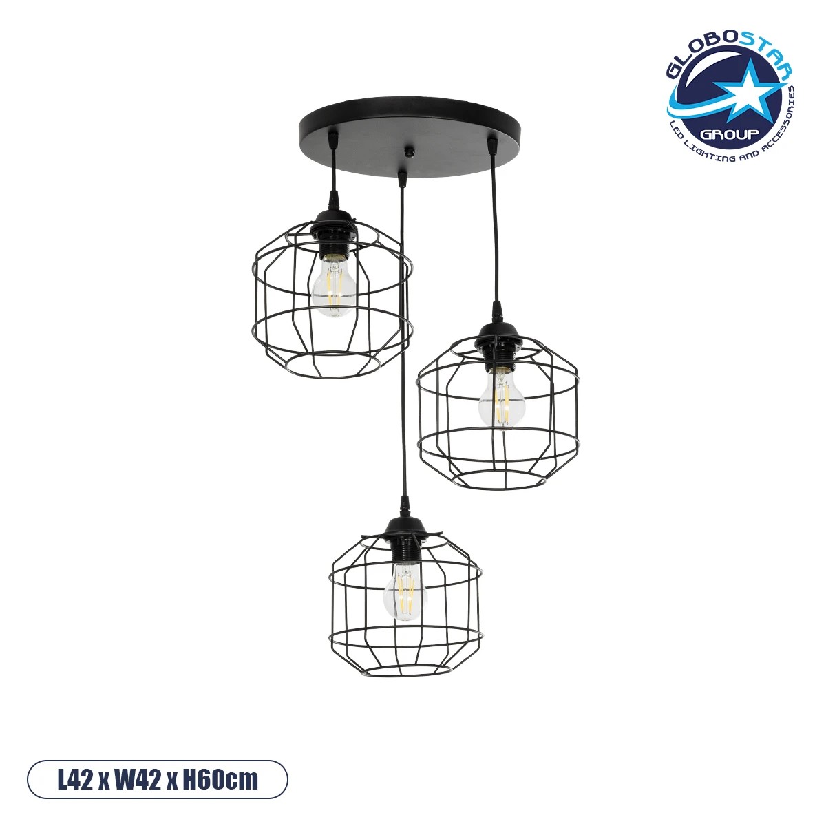 LEDTM® RAYNO 201-0108 Vintage Κρεμαστό Φωτιστικό Οροφής με Ντουί 3 x E27 AC 220-240V IP20 - Μαύρο - Μ42 x Π42 x Υ60cm