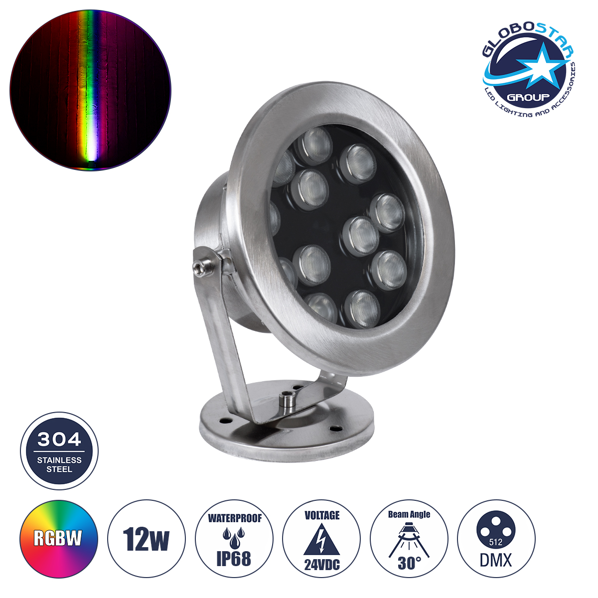 LEDTM® UNDERWATER-DENIS 90431 Υποβρύχιος Προβολέας Σποτ για Σιντριβάνια/Πισίνες LED 12W 1020lm 30° DC 24V Αδιάβροχο IP68 RGBW DMX512 Dimmable – Ανοξείδωτο Ατσάλι 304 – Μ14.5 x Π7 x Υ17cm – 3 Χρόνια Εγγύηση